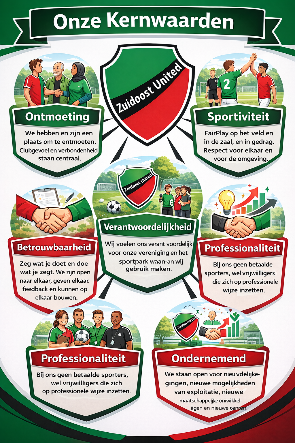 Zuidoost United is er voor haar leden, hun familie(s), de vrijwilligers, bezoekende sporters, sponsoren en leveranciers, de omwonenden, schoolkinderen en overige burgers van Amsterdam Zuidoost. Zuidoost United wil de leukste voetbalclub van Amsterdam Zuidoost zijn. Waar elk lid zich thuisvoelt, en waarbij de vereniging door haar activiteiten een positieve bijdrage levert aan de leefbaarheid van de buurt, maar ook aan de gezondheid van haar leden.